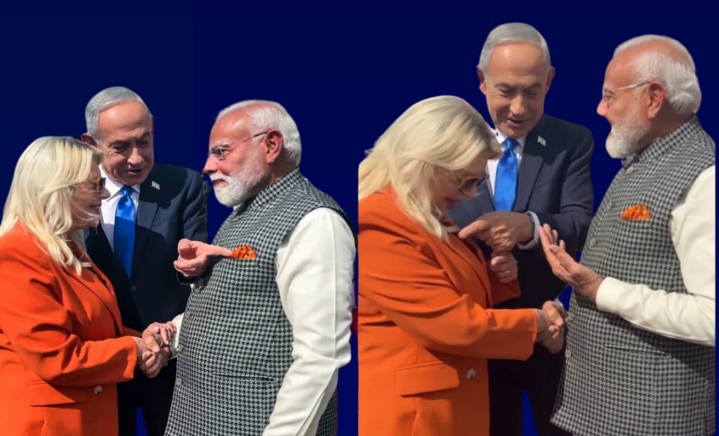 முன்னதாக, இரண்டாவது முறையாக இரண்டு நாட்களுக்கு முன்னர் இஸ்ரேலுக்குச் சென்ற இந்துத்துவக் கொள்கை கொண்ட இந்தியாவின் பிரதமர் நரேந்திர மோடி காவி நிற கைக்குட்டையை மேல் சட்டையில் வைத்துக்கொண்டு தரையிறங்கினார். அவரைக் “காவி” நிற உடை அணிந்து வந்து வரவேற்றார் இஸ்ரேல் பிரதமர் நெதன்யாகுவின் மனைவி சாரா நெதன்யாகு. இந்த இரண்டு “Same Pinch” வண்ணப் பொருத்தங்களை சுட்டிக்காட்டி மகிழ்ந்தார் இஸ்ரேல் பிரதமர் நெதன்யாகு.