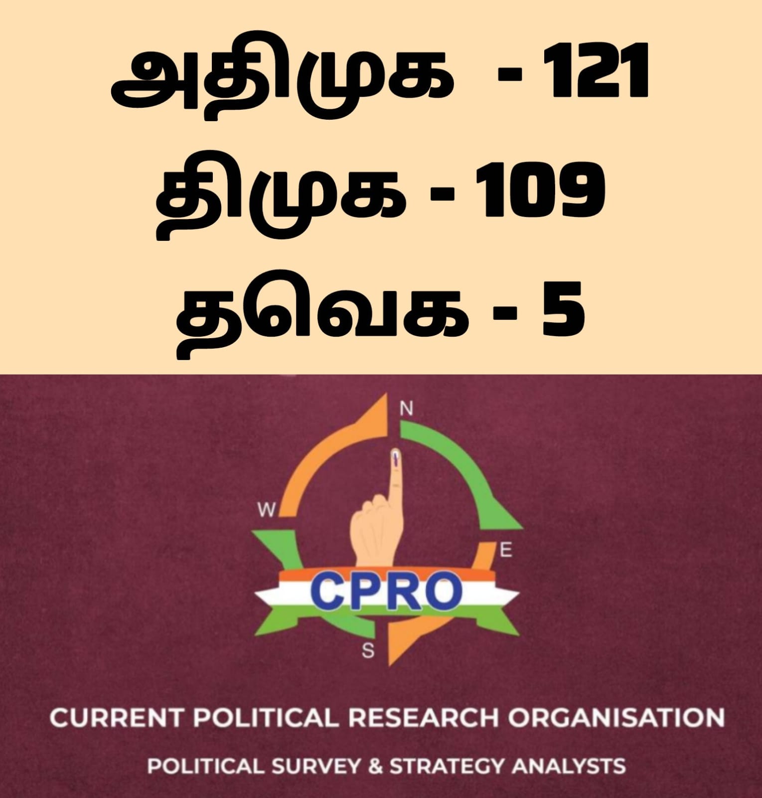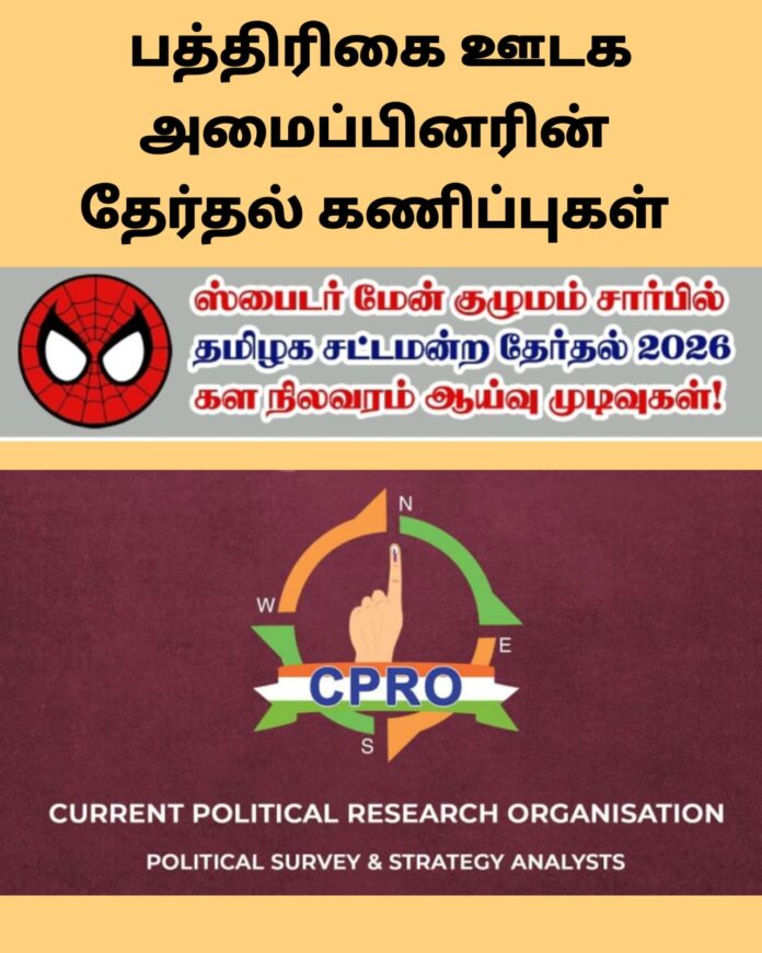 அதேபோல, “சென்னை ப்ரெஸ் க்ளப்” அமைப்பை நடத்திவரும் பத்திரிகையாளர் விமலேஸ்வரன் தலைமையிலான CPRO – Current Political Research Organisation அரசியல் ஆய்வு அமைப்பு தமிழ்நாட்டின் 234 தொகுதிகளிலும் கடந்த ஓராண்டாகத் தொடர்ந்து மேற்கொண்ட கள ஆய்வு முடிவுகளை வெளியிட்டுள்ளது.